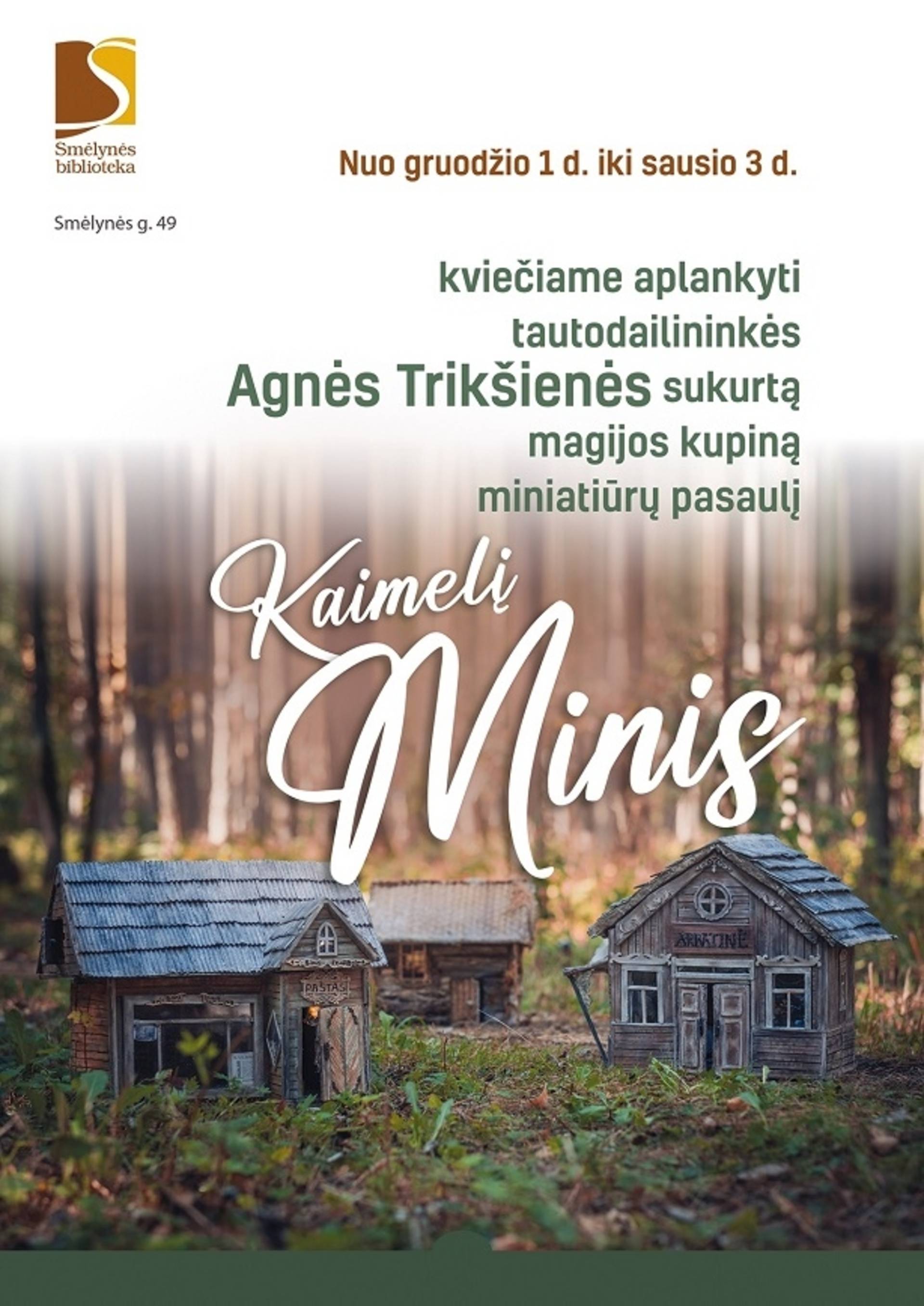 Smėlynės bibliotekoje (Smėlynės g. 49) eksponuojama tautodailininkės Agnės Trikšienės (Kaunas) miniatiūrų paroda "Kaimelis Minis".