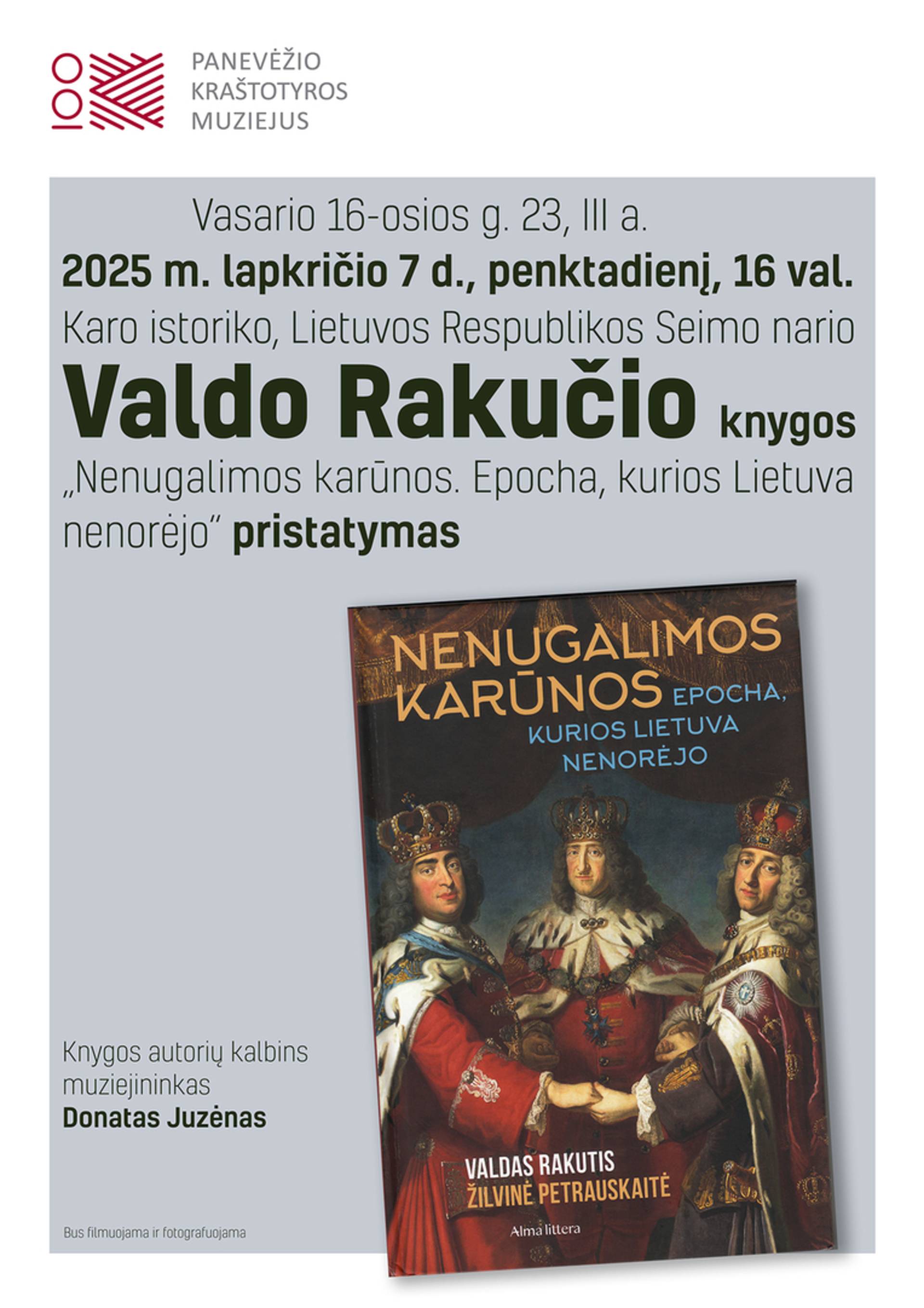 Lapkričio 7 d. 16 val. Panevėžio kraštotyros muziejuje (Vasario 16-osios g. 23) vyks karo istoriko, Lietuvos Respublikos Seimo nario Valdo Rakučio knygos „Nenugalimos karūnos. Epocha, kurios Lietuva nenorėjo“ pristatymas.